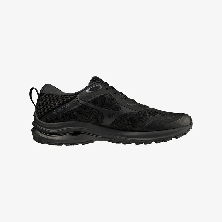 The Mizuno Wave Rider GTX in Black/Ebony/Black for men is a performance-oriented running shoe built to handle tough weather conditions. It features a GORE-TEX® waterproof membrane that keeps feet dry while maintaining breathability, making it ideal for wet or muddy runs. The shoe incorporates Mizuno Wave technology for responsive cushioning and stable support, along with a durable X10 rubber outsole for enhanced traction on varied terrain. With its all-black, understated design, it offers both functionality and a sleek, modern look for runners who need all-weather reliability and comfort.